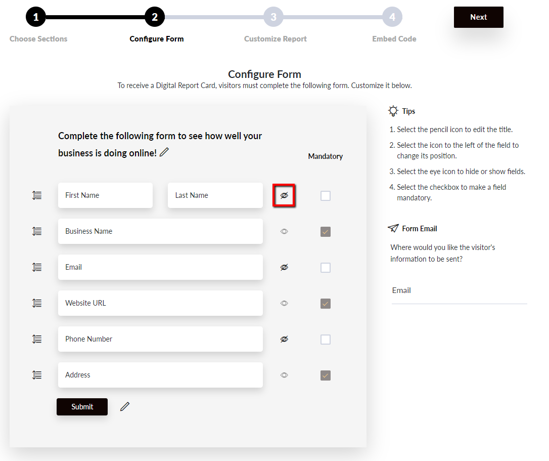 - In step 2, select the eye icon to make the field visible or not visible on your digital report card form